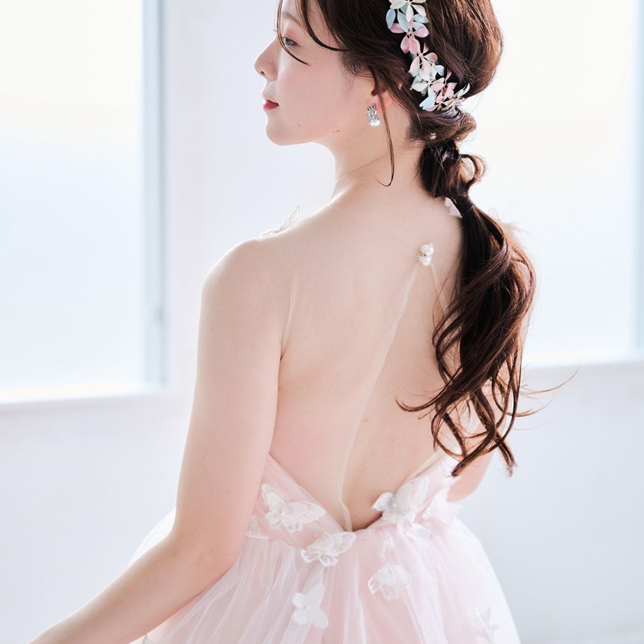 愛らしい印象を一気に変えるこだわりのバックスタイルは、スキンカラーチュールを使用し、後ろ姿をより綺麗に見せてくれるデザインにもご注目です🪞